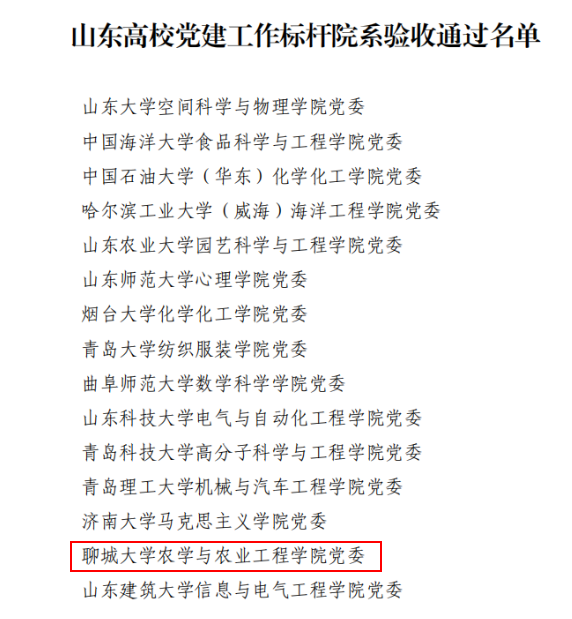 日前,山东省委教育工委公布了第二批山东高校党建“双创”培育创建工作验收通过名单,澳门十大电子正规游戏网站党委(原澳门十大电子正规游戏网站农学与农业工程学院党委)圆满完成“山东高校党建工作标杆院系”培育创建任务,通过验收。