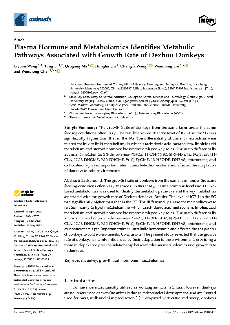 澳门十大电子官网2022级动物学专业研究生王莉源在《Animals》杂志上发表了题为“Plasma Hormone and Metabolomics Identifies Metabolic Pathways Associated with Growth Rate of Dezhou Donkeys”的研究论文,指导教师为刘文强教授、柴文琼副教授。