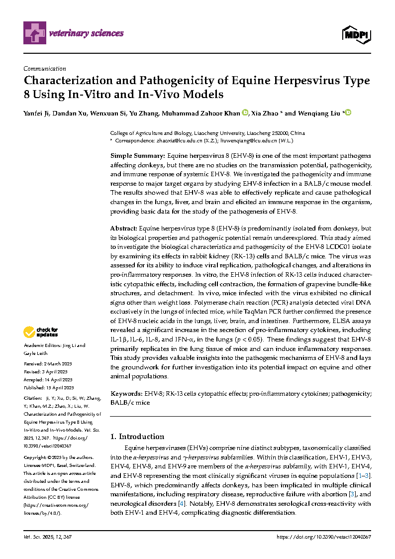 澳门十大电子官网2022级动物学专业研究生纪言霏在《Veternary Science》杂志上发表了题为“Characterization and Pathogenicity of Equine Herpesvirus Type 8 Using In-Vitro and In-Vivo Models”的研究论文,指导教师为刘文强教授、赵霞博士。