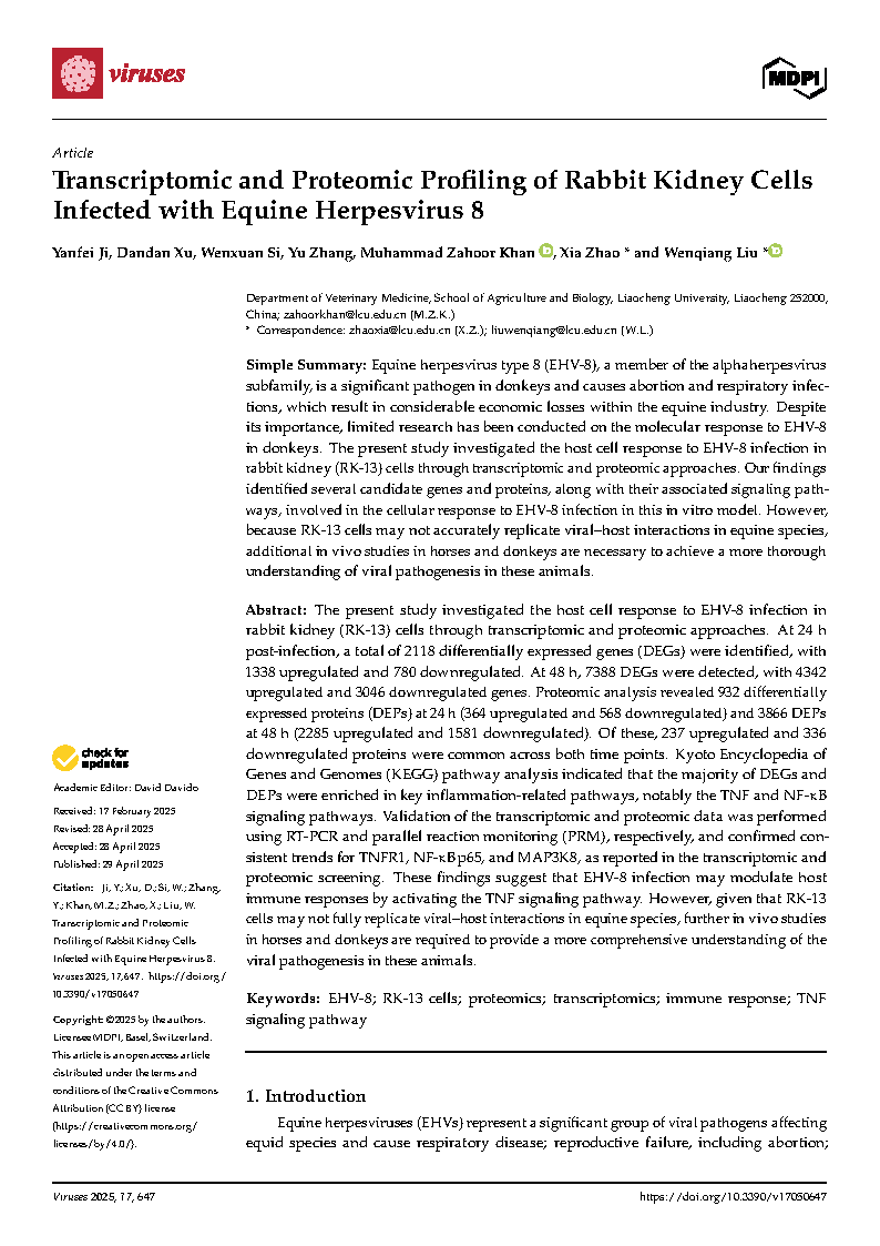 澳门十大电子官网2022级动物学专业研究生纪言霏在《Viruses-Basel》杂志上发表了题为“Transcriptomic and Proteomic Profiling of Rabbit Kidney Cells Infected with Equine Herpesvirus 8”的研究论文,指导教师刘文强教授、赵霞博士。