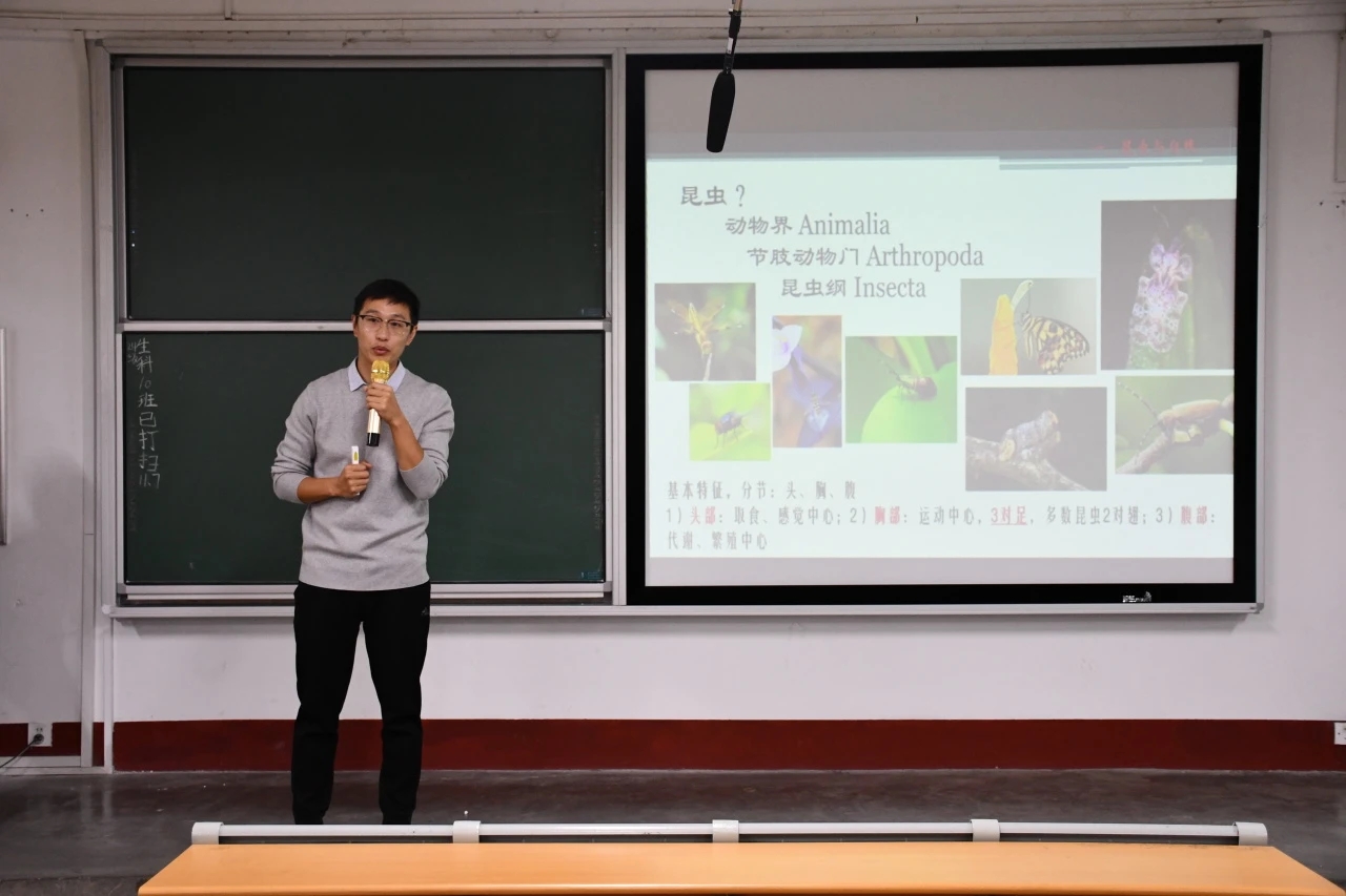 为贯彻落实国家对科普教育的重要指示精神,进一步加强澳门十大电子官网美育工作,培育和提升学生对自然科学的兴趣和探索精神,同时培养他们尊重生命、热爱自然的道德情怀,11月10日,澳门十大电子正规游戏网站于东校区2号教学楼516教室举办“博雅大讲堂:昆虫分类——热爱与自然之美”活动,于帅老师担任主讲。