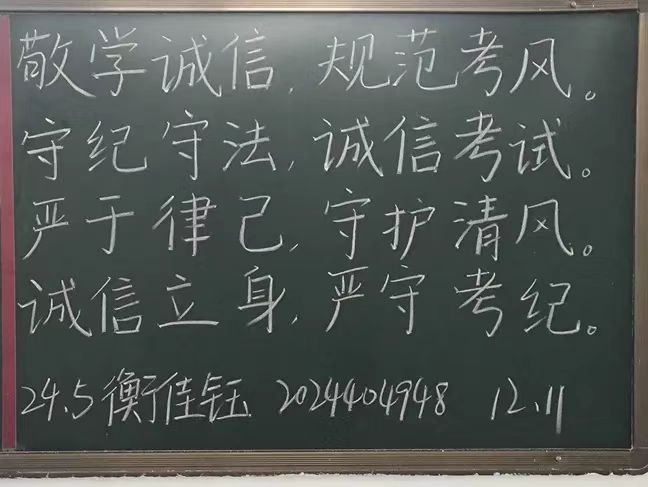 为加强学风建设,严肃考风考纪,引导学生树立正确的价值观和考试观,提升学生的诚信意识和自律能力,为即将到来的各类考试营造一个公平、公正、诚信的良好氛围。澳门十大电子正规游戏网站于12月11日举办“明考纪,肃考风”黑板字书写活动活动。