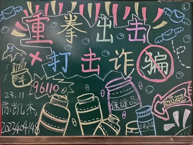 活动伊始,同学们围绕反诈骗这一核心主题展开头脑风暴,大家深入研究常见的诈骗手段,诸如网络刷单诈骗、冒充公检法诈骗、冒充熟人诈骗等。在创作过程中,同学们充分发挥各自的特长,擅长绘画的同学用细腻的笔触勾勒出各种警示图案,有的画出种种“保健品”,暗示常见的诈骗手段,有的画出象征诈骗陷阱的骷髅,寓意着一旦陷入便难以脱身;有的绘制出警察叔叔英勇打击诈骗分子的形象,传递出正义必将战胜邪恶的信念;有的同学则精心撰写朗朗上口的反诈标语,“全民反诈,共筑平安”、“谨防诈骗,守护财产”等话语醒目地呈现在板报上,简单易懂却又极具警示作用。不少同学还将“96110”反诈专线巧妙地融入板报设计中,通过醒目的颜色和独特的排版,提醒大家一旦遭遇可疑情况,要及时拨打这个求助渠道。还有同学别出心裁地在板报上设置了“反诈小课堂”板块,详细列举了不同类型诈骗的防范要点,从网络交友需谨慎到不随意透露个人信息,内容全面且实用。活动结束后,经画面设计、色彩、绘图、文字等多方面经综合评审,张宇等荣获一等奖,薛夫慧等获得二等奖,余西子等获得三等奖。