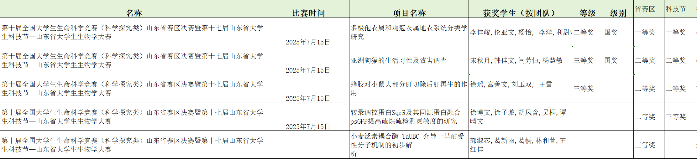 本次大赛由山东省科学技术协会、山东省教育厅等单位联合主办,吸引了全省数十所高校的数百支队伍参赛。澳门十大电子官网5支参赛团队在此次赛事中表现出色,凭借扎实的专业知识、创新的研究思路和严谨的科学态度,斩获佳绩,为学院和学校赢得了显著荣誉。澳门十大电子官网被推荐获全国大学生生命科学竞赛(2025,科学探究类)国家级奖项二等奖1项、三等奖2项,获省级奖项一等奖1项、二等奖3项、三等奖1项,并获得山东省大学生生物学大赛一等奖1项、二等奖2项、三等奖1项。