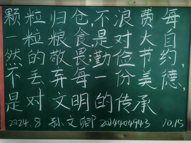 民以食为天,食以粮为先。粮食是生命的基础,节约是对未来的承诺。活动现场,同学们热情高涨,积极参与,他们纷纷拿起粉笔,在黑板上用心书写着有关节约粮食的佳句。一行行整齐划一的字迹,如同跳动的音符,奏响了节约粮食的乐章;一句句富含哲理的话语,如同晨钟暮鼓,唤醒了每个人心中对粮食的尊重与珍惜。“颗粒归仓,不浪费每一粒粮食,是对大自然的敬畏。”这句话揭示了粮食的珍贵与得来不易,它敦促我们要对自然的馈赠怀有敬畏之心,珍惜眼前的每一粒粮食。“勤俭节约,不丢弃每一份美德,是对文明的传承。”这句富有教育意义的话语,不仅警示我们要珍惜手中的每一份资源,更强调了个人的节约行为对整个社会文明传承的重要性。同学们在书写这些警句的过程中,心灵得到了洗礼,对节约粮食的认识也更加深刻。通过这次活动,同学们对节约粮食的理解不再停留于表面,而是深入到了精神层面。他们纷纷表示,将以此次活动为契机,将节约粮食的理念内化于心、外化于行,在日常生活中自觉践行节约粮食的每一个细节,共同为构建节约型社会贡献自己的力量。