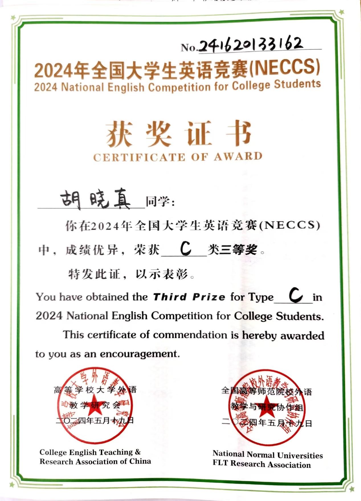 澳门十大电子官网胡晓真同学在2024年全国大学生英语竞赛中荣获三等奖,对该获奖同学予以祝贺表彰。