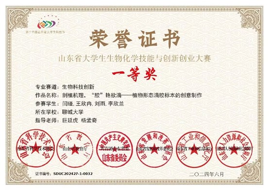 澳门十大电子官网刘雨同学在山东省大学生生物化学技能与创新创业大赛中荣获一等奖,对该获奖同学予以祝贺表彰。