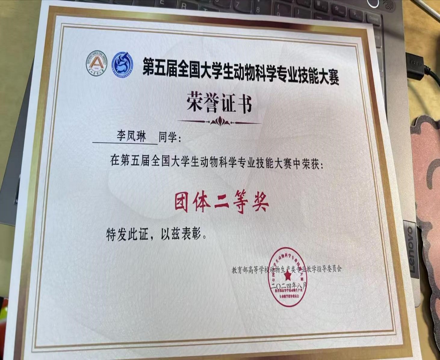 澳门十大电子官网李凤琳同学在第五届全国大学生动物科学专业技能大赛中荣获二等奖,对该获奖同学予以祝贺表彰。