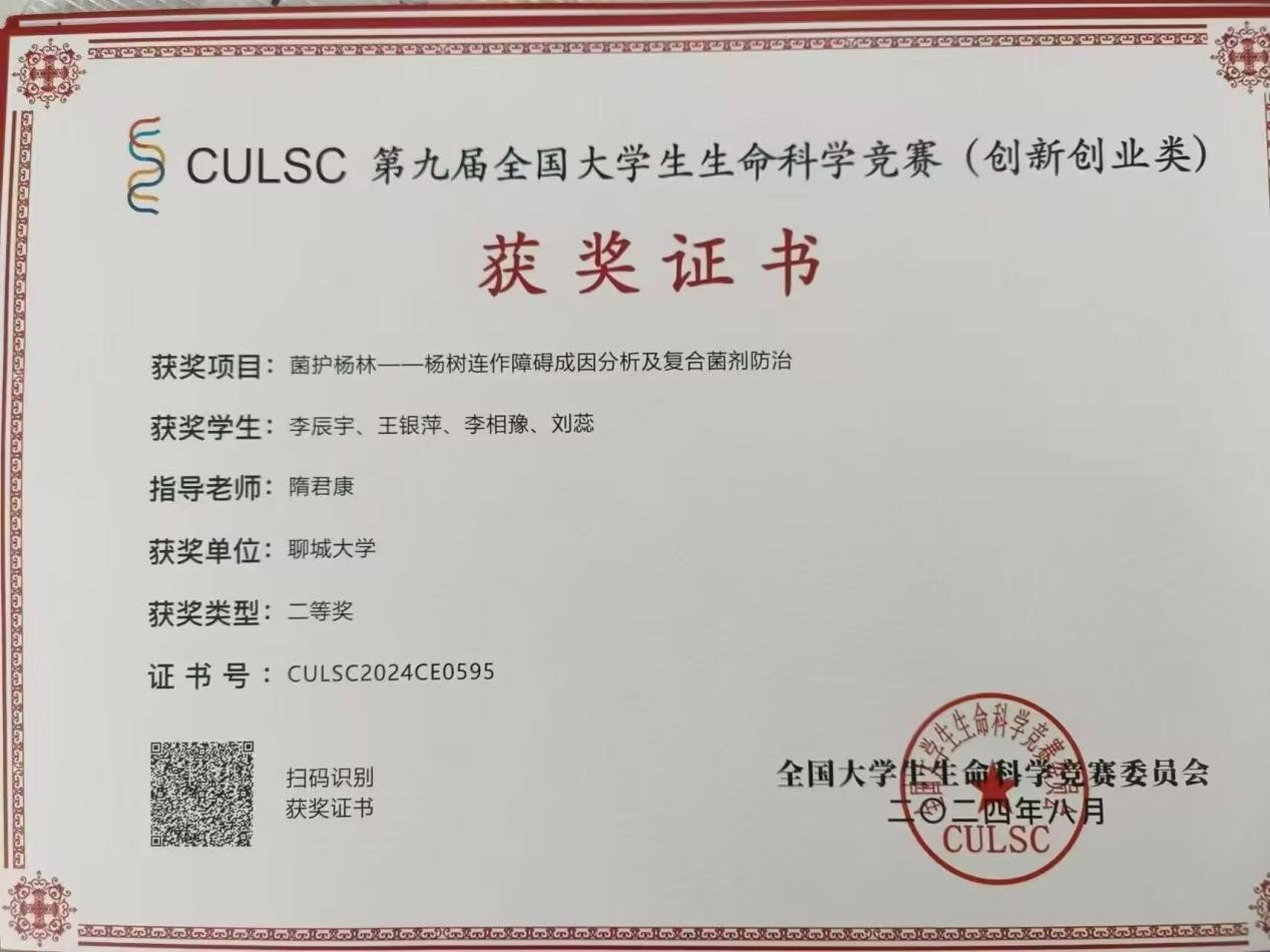 澳门十大电子官网刘蕊同学在CULSC第九届全国大学生生命科学竞赛中荣获二等奖,对该获奖同学予以祝贺表彰。