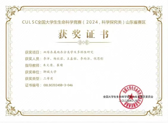 澳门十大电子官网王嘉铭同学在CULSC全国大学生生命科学竞赛(2024,科学探究类)山东省赛区中荣获三等奖,对该获奖同学予以祝贺表彰