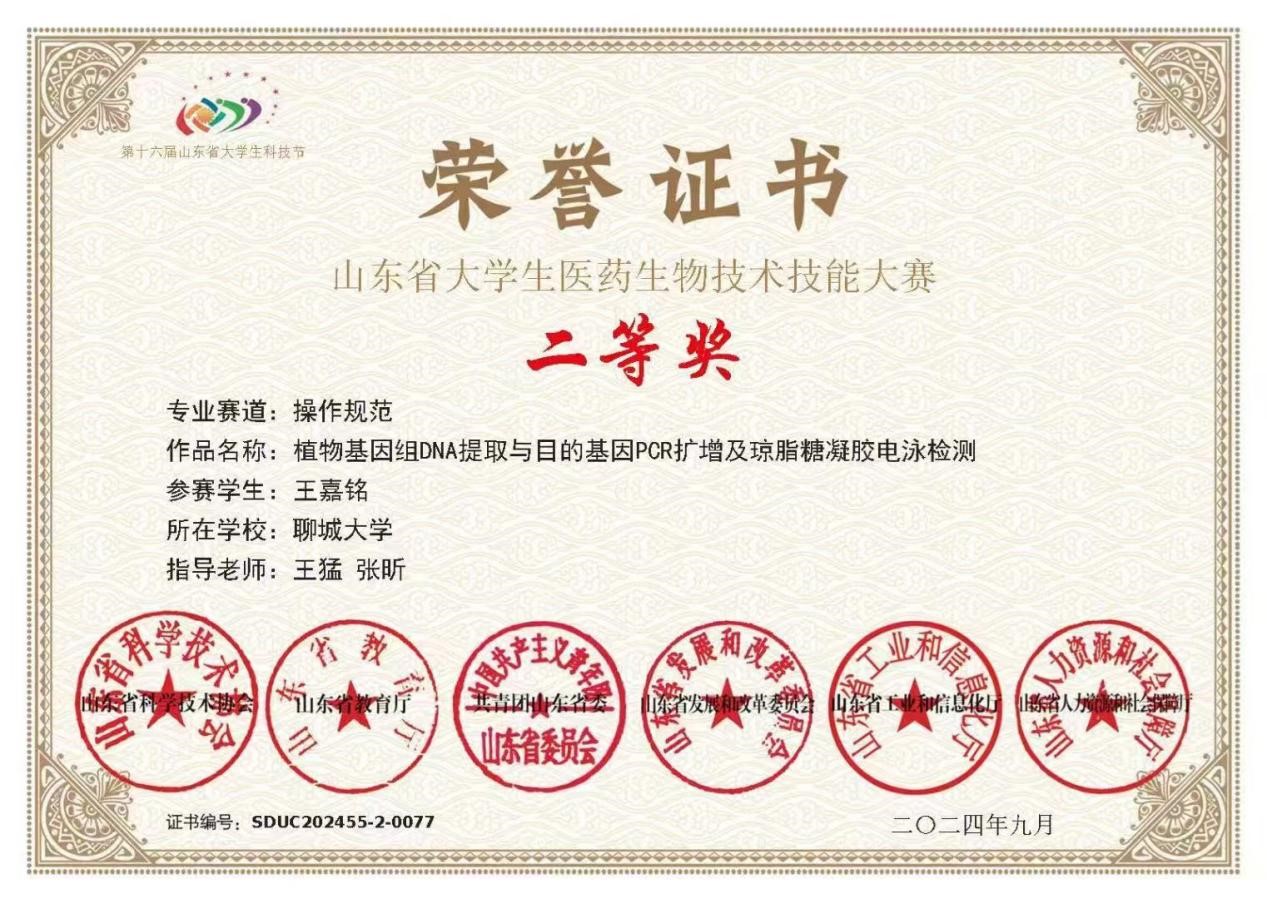 澳门十大电子官网王嘉铭同学在山东省大学生医药生物技术技能大赛中荣获二等奖,对该获奖同学予以祝贺表彰。