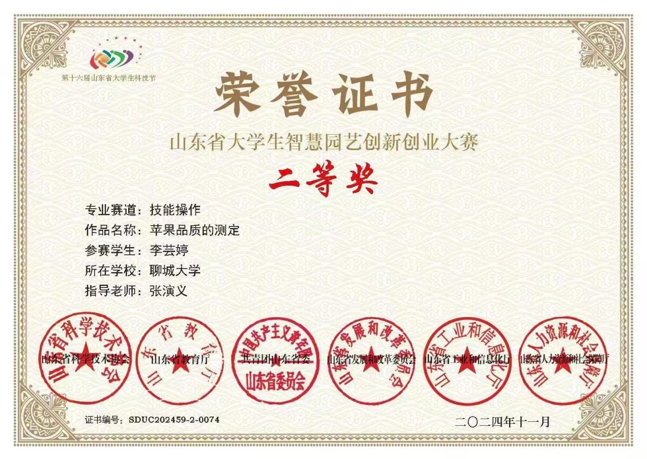 澳门十大电子官网李芸婷同学在山东省大学生智慧园艺大赛中荣获二等奖,对该获奖同学予以祝贺表彰。