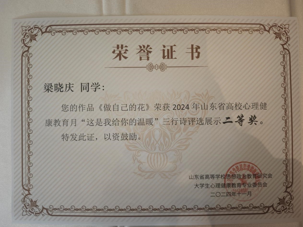 澳门十大电子官网梁晓庆同学在2024年山东省高校心理健康教育月“这是我给你的温暖”三行评选展示荣获二等奖,对该获奖同学予以祝贺表彰。