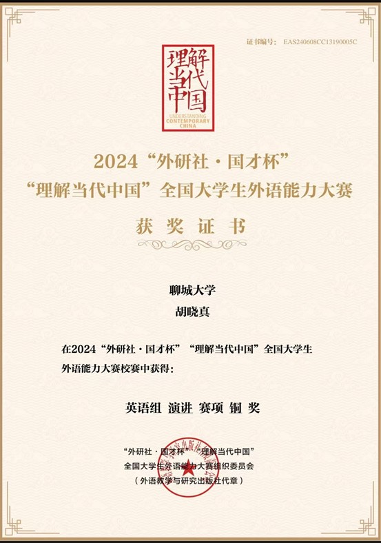 澳门十大电子官网胡晓真同学在2024外研社国才杯全国大学生外语能力大赛荣获校赛演讲铜奖,对该获奖同学予以祝贺表彰。